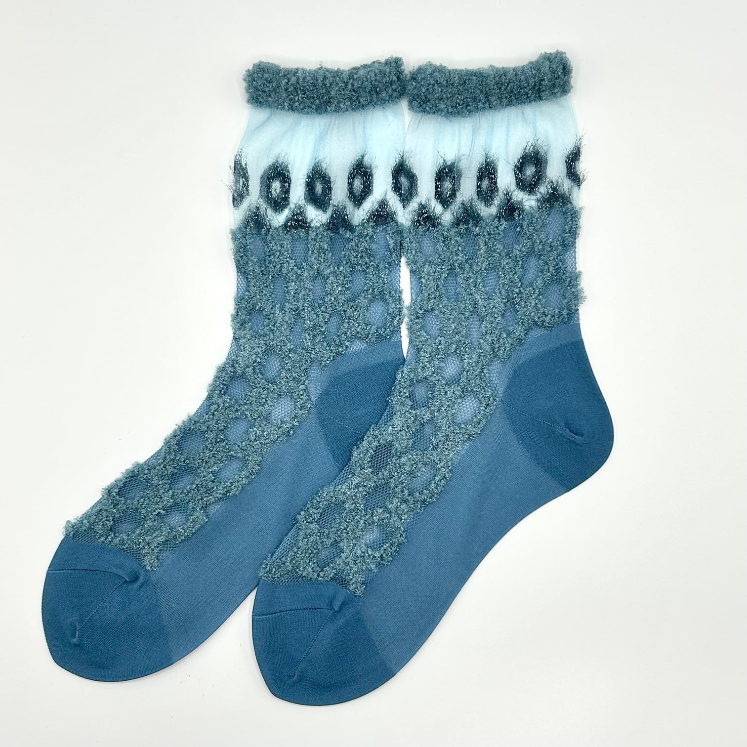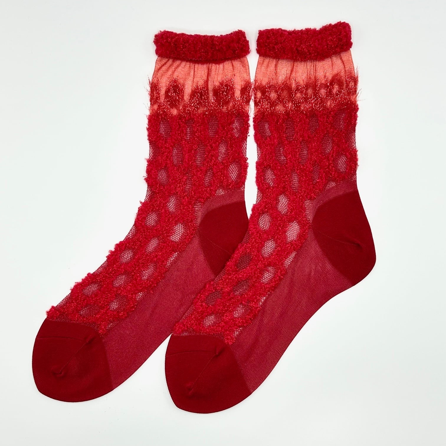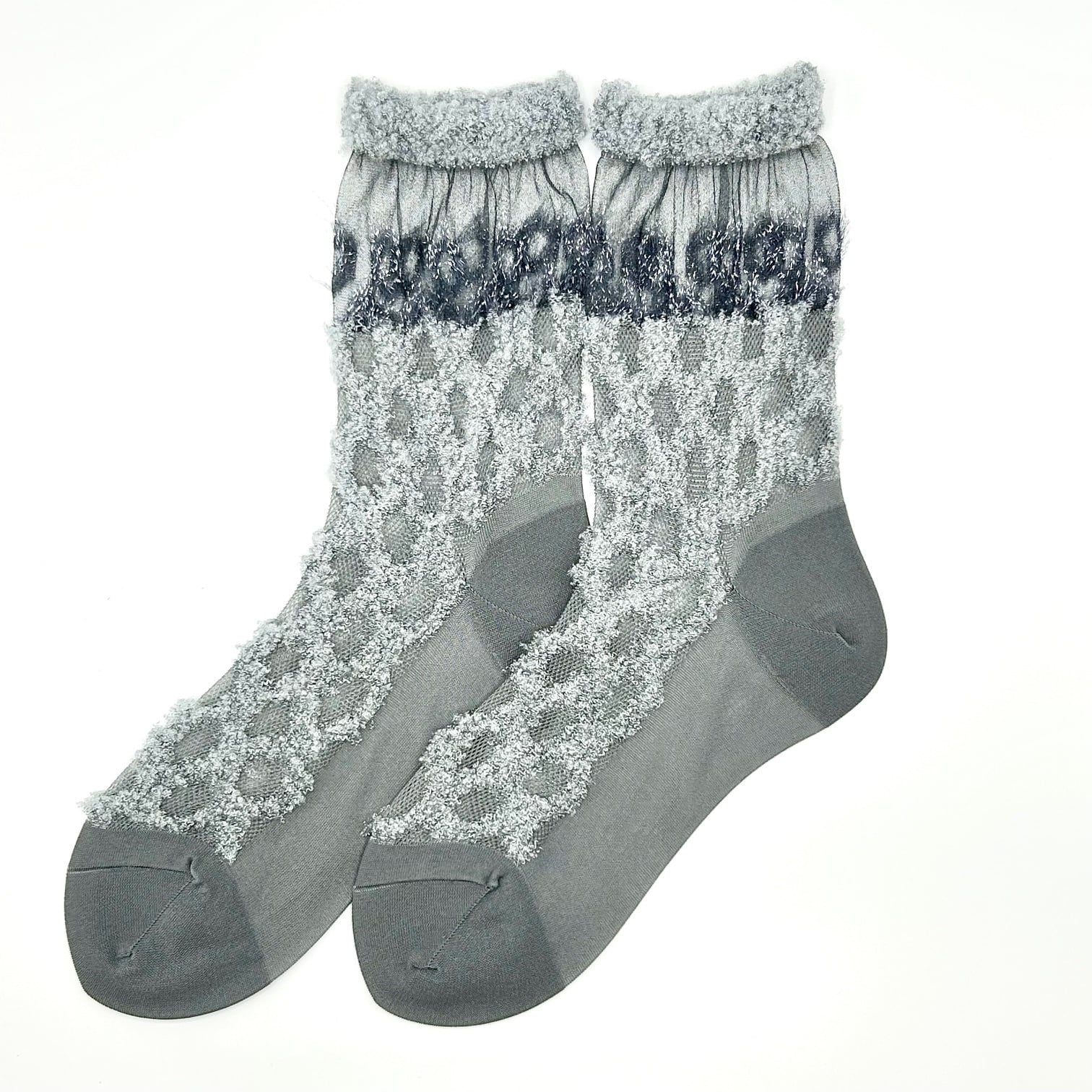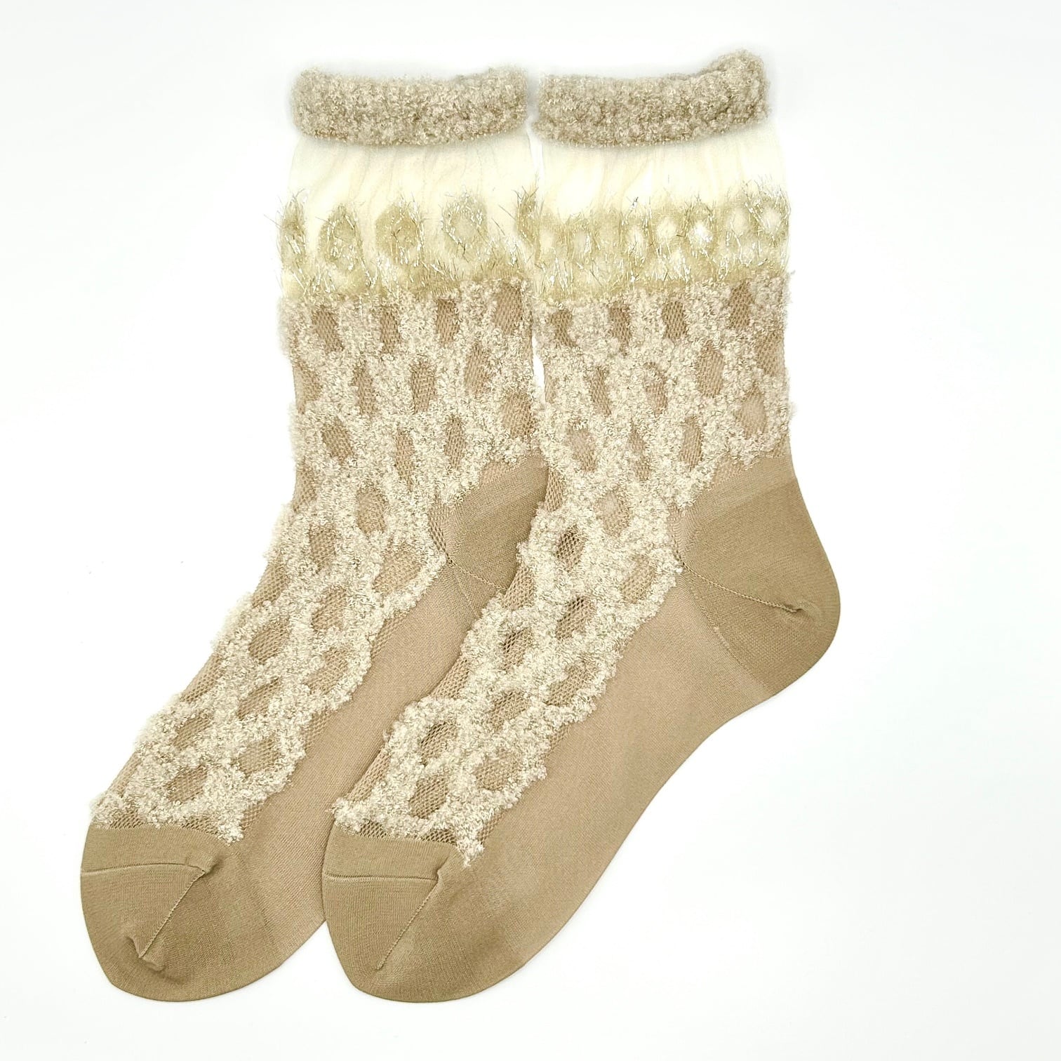 モコモコした糸は使わず、繊細な糸でシャープに編んでいますので滑らかな履き心地になっています。