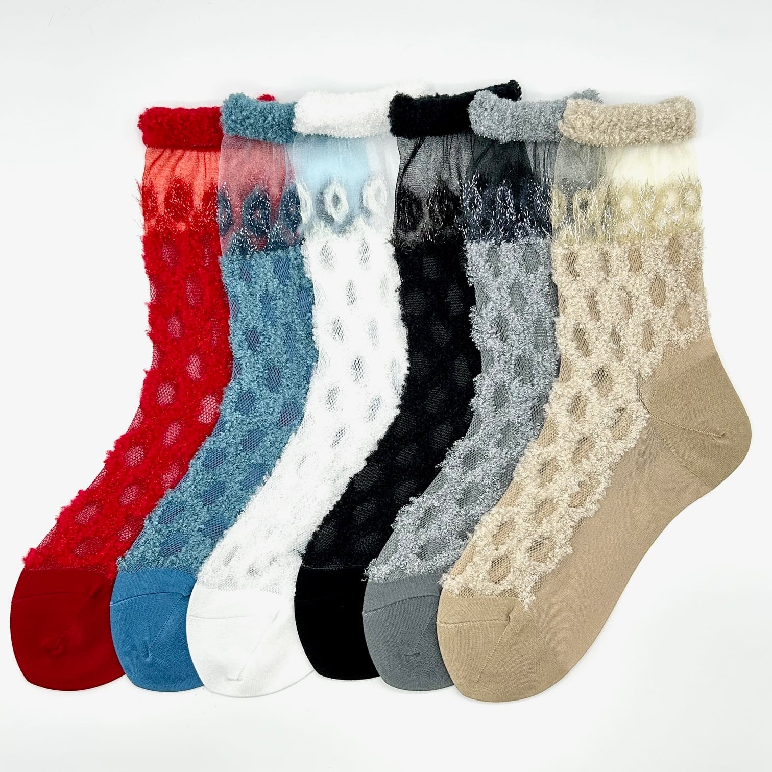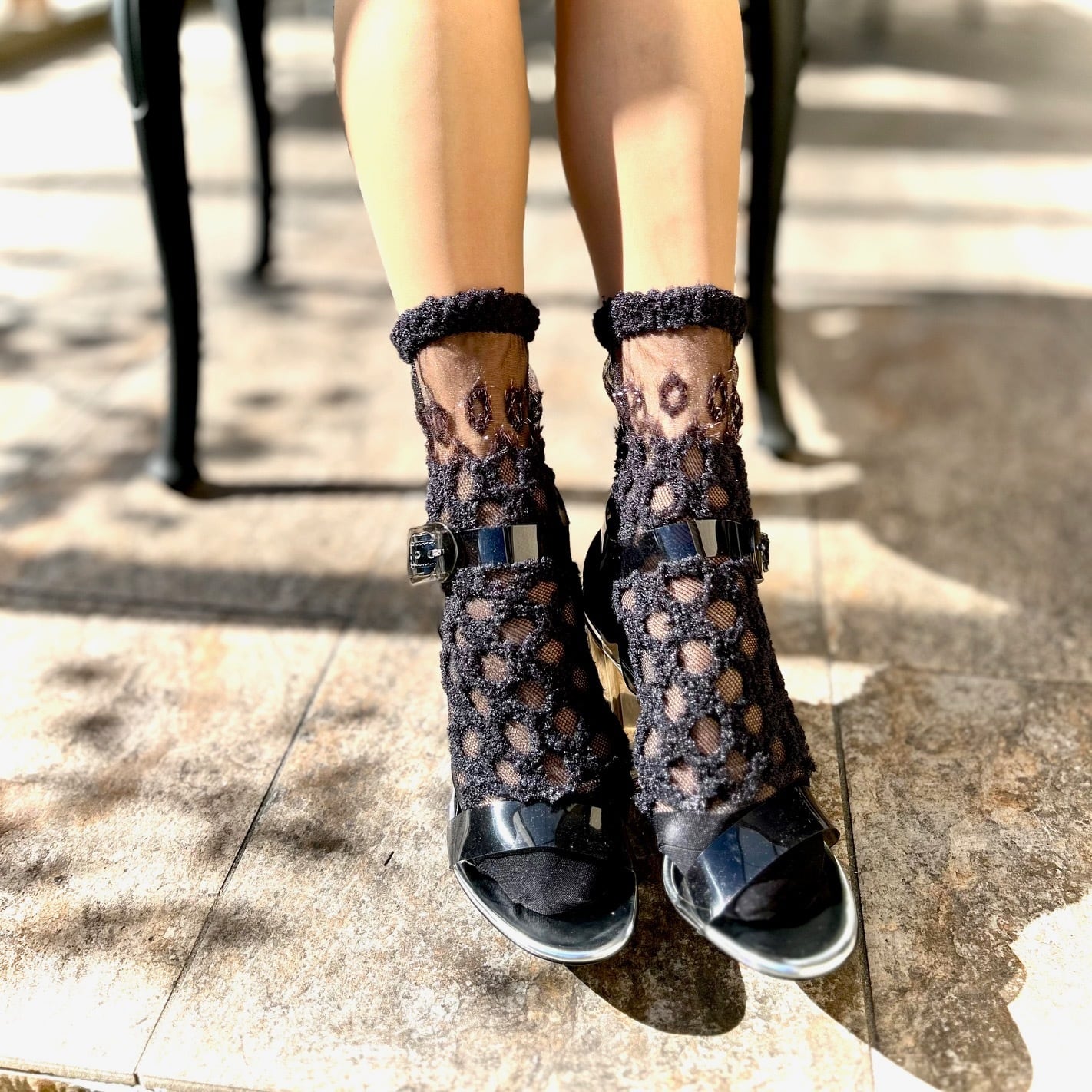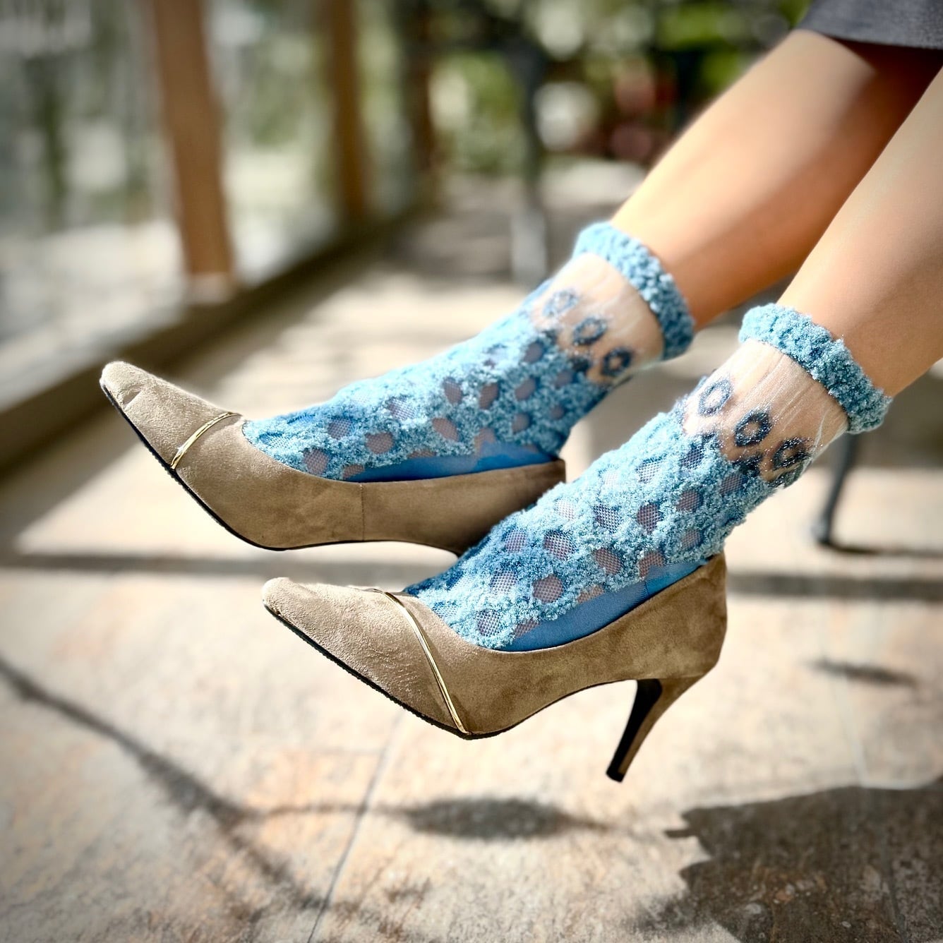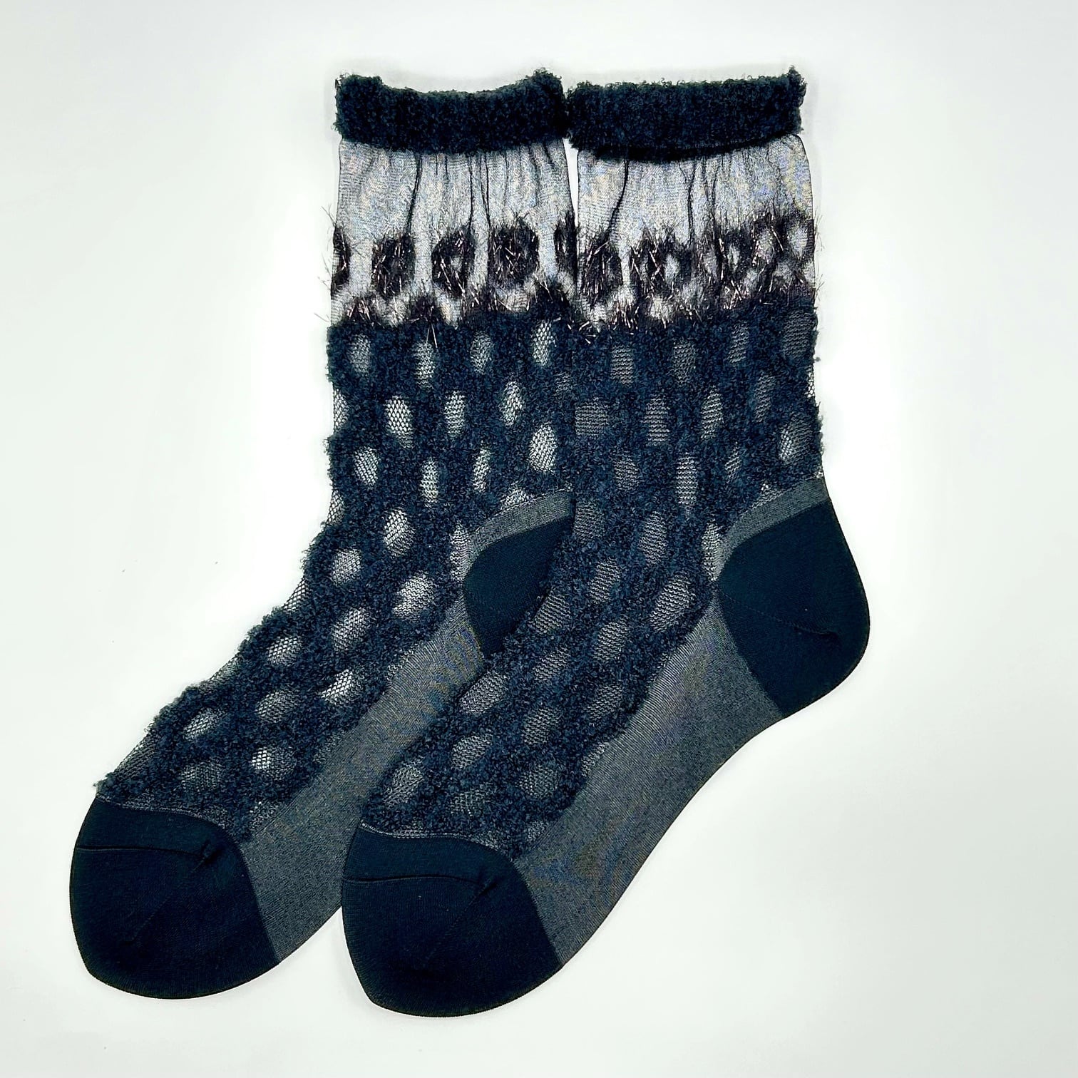 モコモコした糸は使わず、繊細な糸でシャープに編んでいますので滑らかな履き心地になっています。